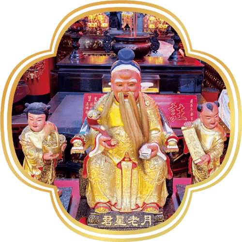又稱月下老人、月老公,是道教中掌管人間姻緣的媒神,形象通常是白鬍長鬚、慈祥的老者,手持姻緣簿和柺杖,用紅線為有緣男女牽起紅線,是「千里姻緣一線牽」的由來,信徒常向祂求取好姻緣、化解孽緣,甚至擴及人緣、事業等多方面福緣。